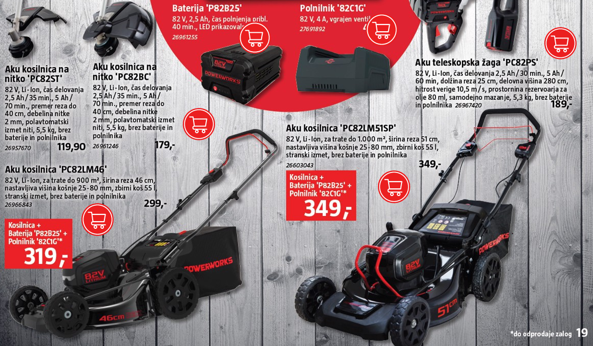 Ja pri teh cenah se bolj splača vzet 51cm (PC82LM51SP), ker tista je samohodna.Kar drago. Lani je bila 46cm z baterijo in polnilcem 230 EUR + kosilnica je bila še samohodna.