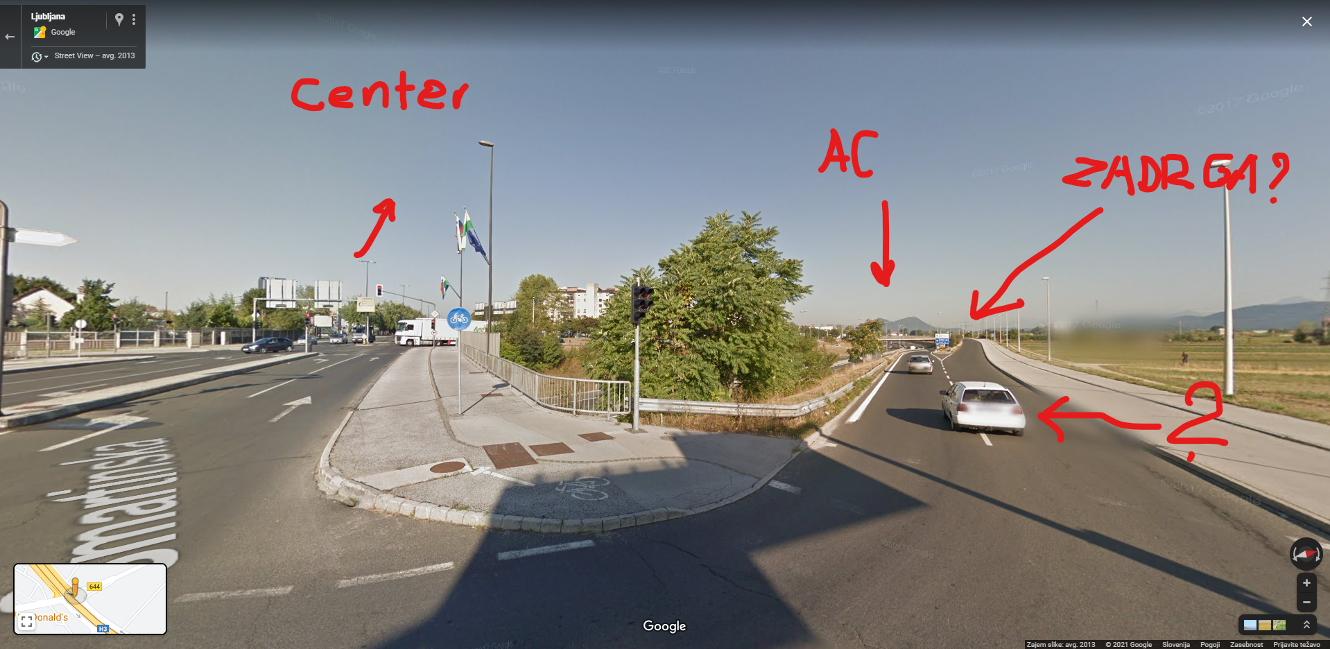 3. Dva pasova levo z vodilno črto med njima. Desni pas zavijanja levo (mat je tole smešen) te pripelje na pas za naravnost, ne AC!