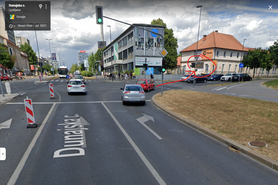 V tem križišču je men en priletel v rit, kriva pa kolesarka, ki je spizdila. Zavijam desno, spremljam nazaj kolesarje, speljem, potem mi pa prileti kolesarka direktno levo na prehod mimo enga kombija, ki je stal tam kjer stoji na sliki bela Škoda. Jest po bremzi, tip za mano pa v mojo rit, ker je spremljal kolesarje, mene pa že videl speljat. Se zgodi, babnica je pa imela srečo, da me ni porinil vanjo.