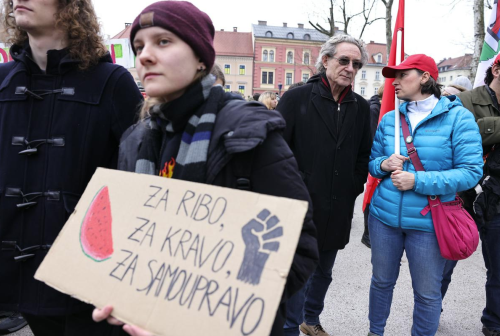 Za ribo. Za kravo. Za samoupravo. Zadaj naključni protestnik.