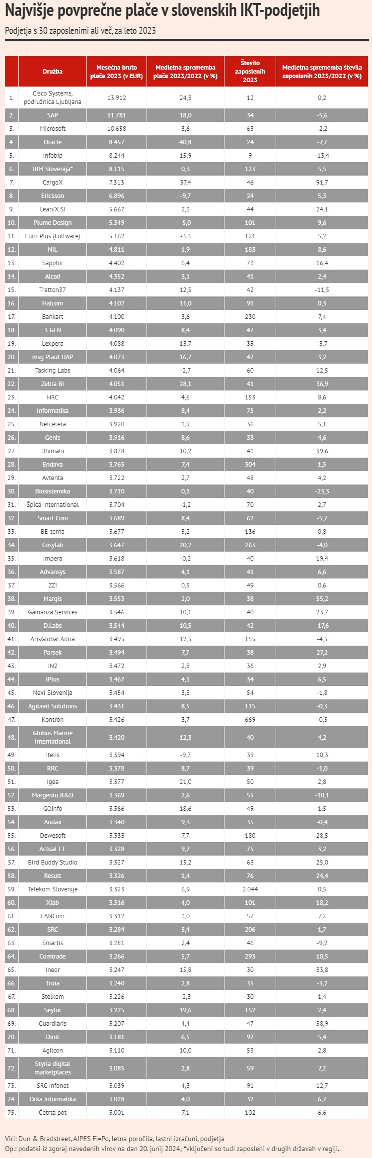 Finance so objavile seznam povprečnih plač v IKT v letu 2023. https://www.finance.si/topjob/katera-ikt-podjetja-najbolje-placujejo-svoje-zaposlene/a/9024904