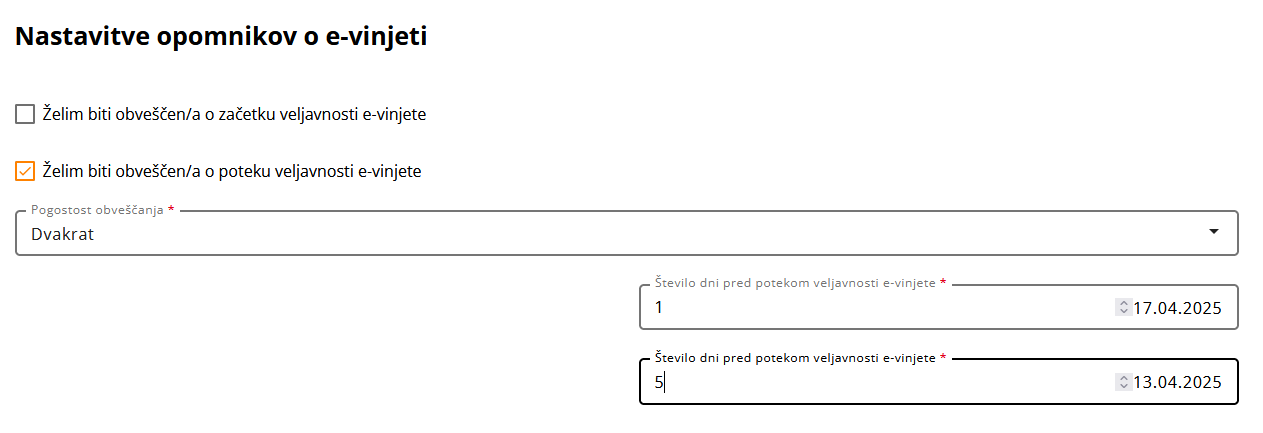 Naj aplikacija zahteva! obveščanje. Plačnik se mora zavestno odločiti brez obveščanja, če ne, ne spusti naprej. Automatsko 5dni pred potekom. Ne, ne želim obveščanja!
