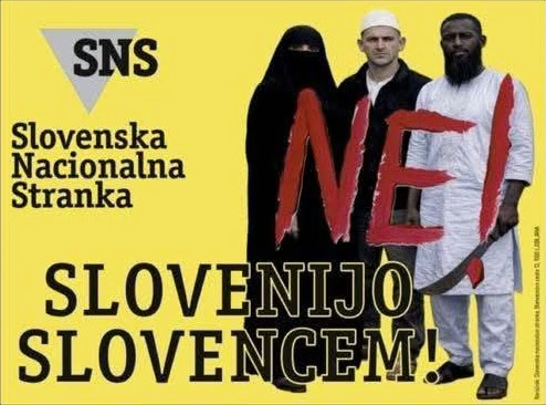 Na plakatu so upodobljeni ženska v muslimanskem oblačilu burka, moški z muslimansko molitveno kapo in temnopolti moški s sabljo v roki. Čez njihovo sliko z rdečo barvo piše: "NE!" Pod sliko pa: "Slovenijo Slovencem!" Na plakatu je ime Slovenske nacionalne stranke, ki je očitno naročnik plakata.