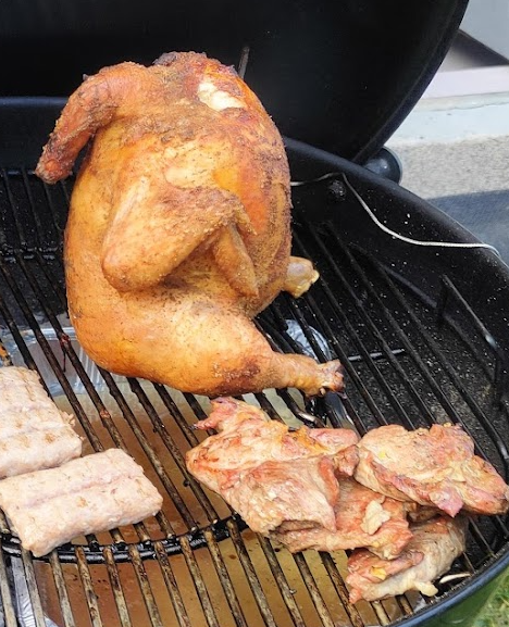 tole so 3 do 3.5 kg piščanci (bele kokoši), ženin nečak jih nakupi male, lepo napita in nato očisti in lokalno proda... to so konkretne ptice, da sem imel primer, da se weber ni zaprl, ko sem jo dal na piksno... sem poiskal eno sliko od prejšnje peke, pa tale je bolj majhen bil :)