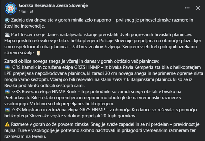 Resno? Ko so odrinili je bilo vreme najslabše možno, napovedano je bilo že cel teden, poleg tega sem 100%, da so jih v domu posvarili pred odhodom. Samo trma pač pripelje v to, kar se je zgodilo. Sestopit bi morali proti Vojam, če so že moral zapustit kočo, tam bi bila najbolšja varianta. Ne pa rinit na travnato pobočje v mokrem snegu.