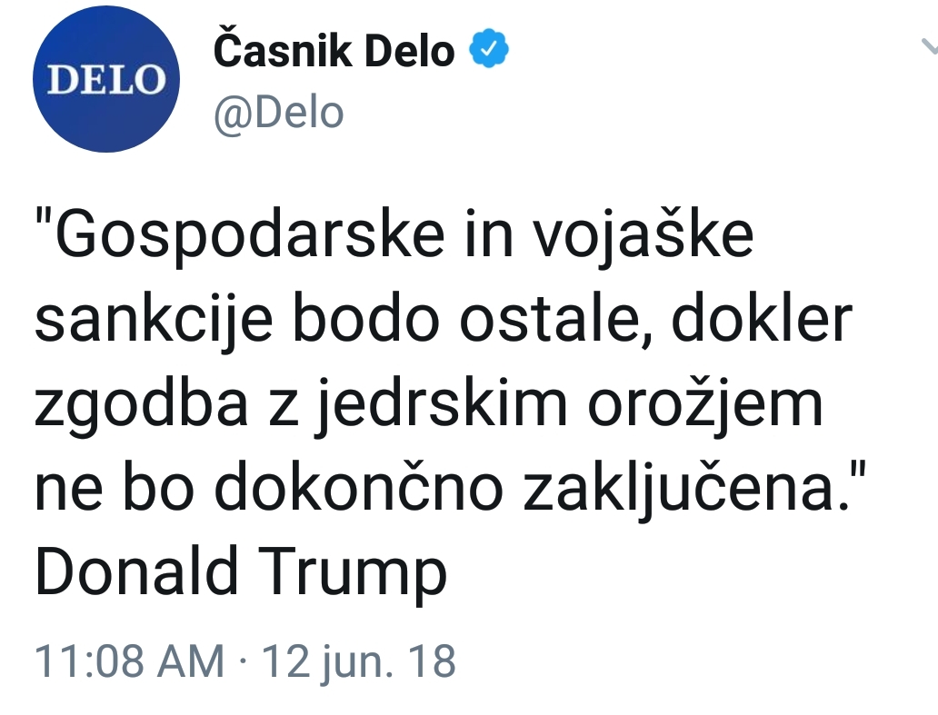 "Ameriški predsednik je še pojasnil, da ameriške vojaške čete zaenkrat ostajajo v Južni Koreji, da pa tam ne bodo več izjavali vojaških vaj, saj da so vojaške vaje tako daleč od doma so neprimerne, drage in provokativne: "Severna Koreja bo to cenila, mi pa bomo prihranili veliko denarja." Tudi sam si sicer želi vseh 32.0000 vojakov čimprej spraviti domov, a to ni bilo del današnjega dogovora, je še odgovoril." (vir: 24ur)