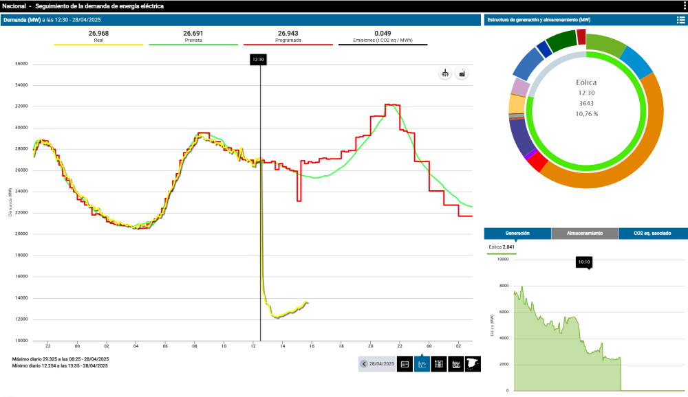 Viri iz španske vlade, ki jih navaja Guardian, so sporočili, da so izpad električne energije zaznali ob 12.33, ko je v petih sekundah nenadoma izginilo 15 gigavatov proizvedene energije – kar je enakovredno 60 odstotkom vse električne energije, ki je bila v tistem trenutku v rabi.