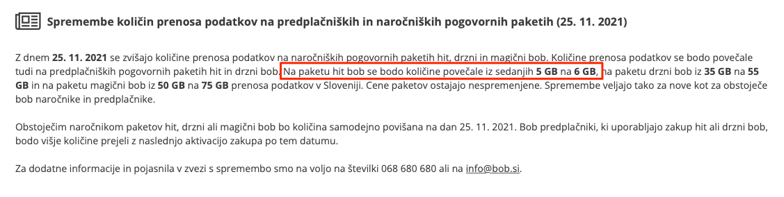 A je še kdo opazil, da se je v paketu HIT BOB količina podatkov zvišala iz 5 na 6 GB? Ker na uradni strani je še vedno samo 5GB v paketu.