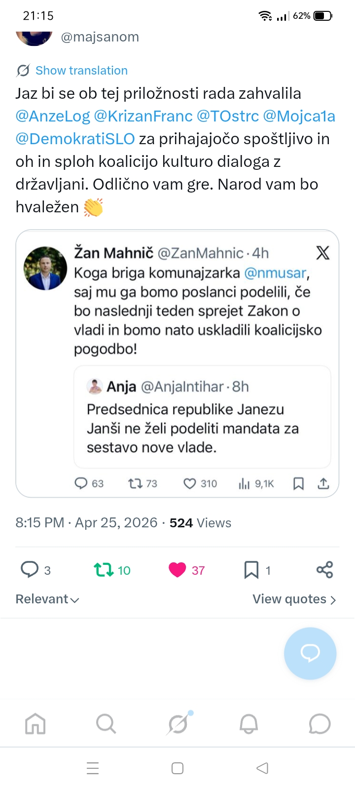 Daniel: Če pustimo Leno in Tamaro za trenutek, je pač treba priznati, da je Mahničevo obnašanje nedoraslo funkciji. Kot poslanec DZ bi moral spoštovati vsaj funkcijo predsednice, če že osebe, ki jo zaseda, ne. Tipčki, kot je on, preprečujejo SDS doseči veliko boljši volivni rezultat. Ker takle diskurz odvrača normalne volivce.